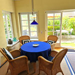 - liebevoll eingerichteter, großzügiger Wohnbereich mit Fernseher und Blick zum Garten
